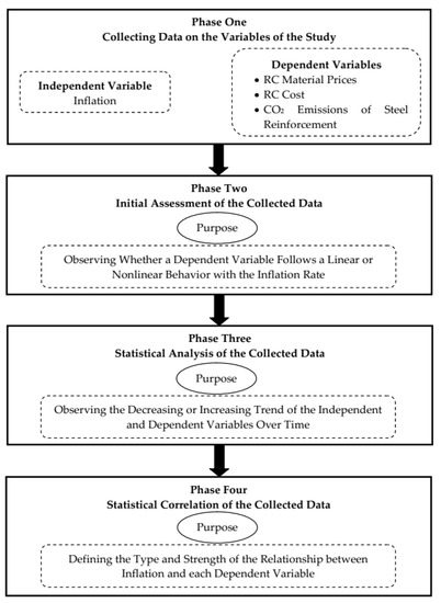 This study analyzes four variables. While inflation is the independent variable, the dependent variables are prices of RC materials, RC cost, and CO2 emissions of steel reinforcement. To examine the relationship between inflation and each of these dependent variables, the methodology consists of four phases. First, data on the variables have been collected from official sources and reputable references related to Egypt’s construction sector. Second, the gathered data have been initially assessed to define their behavior (i.e., linear or nonlinear). According to Alaloul et al. [31], this is a very significant step because determining the appropriate correlation test is associated with the behavior of the data. Third, the compiled data have been statistically analyzed by calculating the Annual Percentage of Deviation (APD) with respect to each variable. This step can help in observing the decreasing or increasing trend of the variables over time and carrying out their correlation analysis [32]. Fourth, by knowing the behavior of the data and the values of the APD of the variables, the proper correlation test can be appointed and performed to define the relationship between inflation and each dependent variable. Figure 1 outlines the four steps of the methodology.