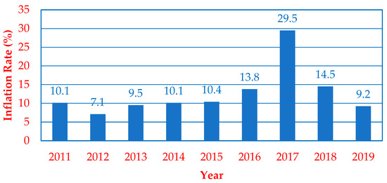 - Inflation: CAPMAS [28] has been employed to identify the annual inflation rate in Egypt from 2011 to 2019. Figure 2 shows the rates of inflation during this time period according to CAPMAS [28].