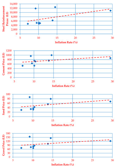 - Third, it was difficult to compare the outputs of this research with those of prior studies concerning the inflation–material prices relationship. The reasons are that while the findings of most of the previous works (e.g., [21]) are based on imprecise methodologies, other results (e.g., [3]) are associated with different economic and political conditions from Egypt’s circumstances.