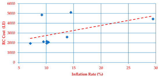 - Second, concerning RC—the wide utilized building material in the Middle East and Egypt, without exception [24]—Hassanein and Khalil [27] reported that RC materials, specifically steel reinforcement and cement, represent 43.98% and 32.29%, respectively, of the construction costs of the Egyptian RC buildings. More importantly, the statistical data of CAPMAS [26] highlighted that steel reinforcement, ordinary Portland cement, sand, and gravel—the major components of RC in Egypt—witnessed severe increases in their prices from 2011 to 2019. In 2011, the average prices of steel reinforcement/ton, ordinary Portland cement/ton, sand/m3, and gravel/m3 were 4778.25 LE, 528.7 LE, 31.83 LE, and 69.15 LE, respectively. Yet, in 2019, the average prices of these materials were 11,892.56 LE, 960 LE, 87.5 LE, and 155 LE. Of course, these sharp movements in the prices of these materials have been affected by inflation during this period. Additionally, the implications of these increases lead to significant changes in the cost of their construction item, i.e., RC. Hence, by collecting the data associated with this period, encompassing inflation rates, RC material prices, and RC cost, this study can define the inflation–RC material prices nexus and the inflation–RC cost relationship. Fortunately, CAPMAS [26] and CAPMAS [28] in Egypt collect credible statistics on such data, providing reliable answers to the first three questions of the present work.
