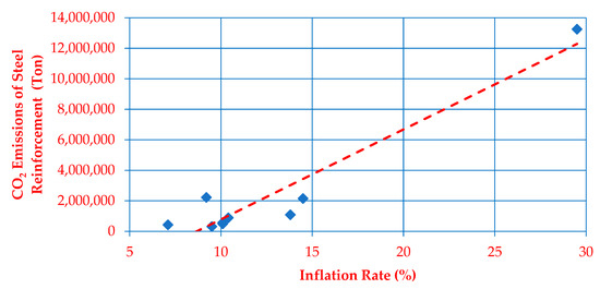 The initial assessment of the data of Figure 2 and Table 1 aims at defining whether they follow a linear or nonlinear behavior. By answering this question, the proper correlation test can be specified to investigate the relationship between the inflation rate and each of RC material prices, RC cost, and CO2 emissions of steel reinforcement [31]. In accordance with Xiao et al. [33] and Musarat et al. [3], if two variables have a linear relationship, their correlation can be investigated based on Pearson correlation test. If not, Spearman correlation test must be called upon. To know whether Pearson or Spearman correlation test is the proper test for analyzing the data of the present research, Figure 3, Figure 4 and Figure 5 have been developed. As shown in these figures, the inflation rate occupies the x-axis. Yet, the y-axes of Figure 3, Figure 4 and Figure 5 represent RC material prices, RC cost, and CO2 emissions of steel reinforcement, respectively. By taking a deep insight into these figures, it can be observed that each figure has an imaginary trend line. More importantly, all the values of the variables of RC material prices, RC cost, and CO2 emissions of steel reinforcement are extremely far from the drawn trend lines. This observation, in turn, implies that the data associated with RC material prices, RC cost, and CO2 emissions of steel reinforcement have a nonlinear relationship with the inflation rate [23]. Accordingly, their correlation tests with the inflation rate can be explored, utilizing Spearman correlation test.