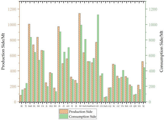 Production-side carbon emissions are based on the production of goods, while consumption-side carbon emissions are based on the products and services consumed by consumers, reflecting the principle of “common but differentiated responsibilities”. Carbon emissions with two types of accounting principles of China’s provinces in 2017 are calculated according to Equations (4) and (5) and are shown in the Figure 1.