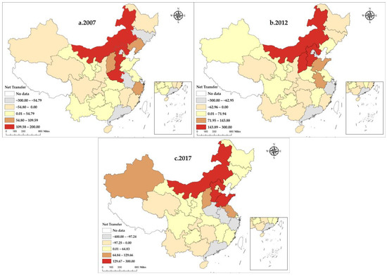 Figure 3 shows that from 2007 to 2017, the number and amount of target provinces where carbon transfers have occurred have increased. As time goes by, the distribution of target provinces showed a significant “westward” and “northward” trend. In 2007, net carbon transfer in provinces was scattered and concentrated in central and western, and southeastern coastal provinces, while target provinces were mainly in the northwest; by 2017, non-target provinces were mainly located in the southwest, and southern coastal regions, while target provinces were mainly located in the northwest. In 2017, net carbon transfers were primarily focused on the southwest and southern coastal provinces, while net carbon transfers were mainly from the northwest and central provinces. It can be seen that the northwest and central regions are the main receiving regions for carbon transfer. As far as the direction of net carbon transfer-out, from the less developed provinces to the developed provinces it is more obvious. Overall, the phenomenon of net carbon transfer-out from domestic trade in China is characterized by a “high in the north and low in the south”.