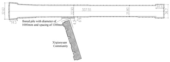 There is a residential building in the Xiqiaoyuan community on the northeast side of the station. The residential building was built in the 1980s, and its structural form is a brick–concrete structure house with six floors above the ground and one floor below the ground. The floor and roof panels are prefabricated houses, belonging to a typical old masonry structure house. The house is 49 m in the east–west direction and 17 m in the north–south direction, with a construction area of 5194.45 m2. The nearest distance between the foundation pit of Renmin South Road Station and the edge of Xiqiaoyuan Community nearby is 6.9 m, and the included angle between the foundation pit and the retaining wall is 60. Foundation pits are excavated immediately adjacent to the structure of the house. Therefore, it is necessary to study the impact of foundation pit excavation on the safety of residential structures. The relative positional relationship between the station foundation pit and the residential building in this community is shown in Figure 1.