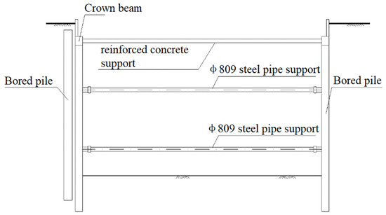 The main retaining structure of the station is supported by bored piles with steel support. The diameter of bored piles is 1000 mm, and the spacing is 1300 mm. The steel support system adopts the internal support method of φ809 steel pipe and reinforced concrete support, and the thickness of the supporting steel pipe is 16 mm. Considering the influence of groundwater, a single-row triaxial deep mixing pile is used to construct the waterproof curtain, with a pile diameter of 850 mm and a spacing of 600 mm.