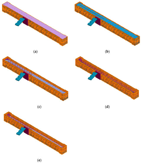 Numerical calculation model of precipitation and excavation conditions of station foundation pit. (a) 1st working condition; (b) 2nd working condition; (c) 3rd working condition; (d) 4th working condition; (e) 5th working condition.