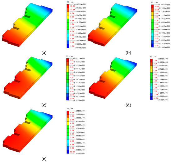 Cloud images of longitudinal displacement of buildings under different working conditions. (a) 1st working condition; (b) 2nd working condition; (c) 3rd working condition; (d) 4th working condition; (e) 5th working condition.