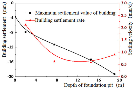 The settlement deformation and velocity of residential buildings change with the depth of foundation pit excavation.