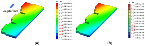 Figure 7 and Figure 8 are the contour of horizontal displacement along the short side direction and the contour of horizontal displacement along the long side direction of residential buildings under different working conditions, respectively. Because the station foundation pit is excavated near the existing Xiqiaoyuan community, the horizontal displacement of residential buildings is mainly along the long side direction. Similar to the change of settlement, the horizontal displacement of residential buildings also shows the characteristics of differential change.