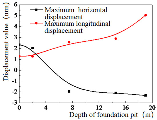 Figure 9 shows the variation curve of horizontal displacement of residential building with foundation pit excavation. During the excavation of the subway station foundation pit, the horizontal displacement of the residential building along the short side gradually tends to be stable, and its maximum value is 2.34 mm. However, the horizontal displacement along the long side increases gradually with the increase of the excavation depth, and its maximum value is 5.05 mm, which is about twice the horizontal displacement along the short side. This may be because the horizontal displacement along the long side direction is perpendicular to the free surface of the foundation pit, and the building tends to tilt along this direction, resulting in the increase of horizontal displacement in this direction. Therefore, in the process of foundation pit excavation, special attention should be paid to the development of horizontal displacement of buildings in the direction perpendicular to the free surface of foundation pit, and the horizontal displacement of buildings in this direction should be monitored in time to ensure the safety of buildings. In addition, by comparing the settlement and horizontal displacement of residential buildings, it can be found that with the excavation of foundation pit, the maximum horizontal displacement of adjacent buildings is about 0.25 times of the maximum settlement.