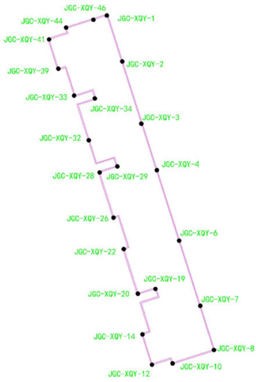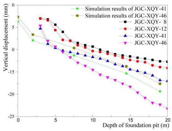 In the process of foundation pit excavation, monitoring points are set around residential buildings, as shown in Figure 10. The settlement of each monitoring point is recorded. Two monitoring points are selected at one side near the foundation pit and one side away from the foundation pit around the residential building, respectively. At the same time, the simulation calculation results of two monitoring points on the side near the foundation pit are selected, and the variation curve of the simulation calculation and the actual monitoring settlement with the excavation depth is shown in Figure 11. As can be seen from the figure, in the early stage of foundation pit excavation, the vertical displacement of each monitoring point basically changes all the time, which shows that the residential building is characterized by approximately uniform subsidence at this time. With the increase of excavation depth of the foundation pit, the vertical displacement of different monitoring points shows certain differences. The vertical displacement of the monitoring point near the foundation pit increases significantly, while the vertical displacement of the monitoring point far from the foundation pit increases slowly. At this time, the building shows the characteristics of differential settlement. With the continuous excavation of the foundation pit, the change of the vertical displacement of the monitoring points slows down again, and the vertical displacement of each monitoring point gradually tends to be stable. It shows that the supporting structure effectively inhibits the deformation of the surrounding soil layer. In the deformation process of the monitoring point, the vertical displacement of JGC-XQY-46 is the largest, because the monitoring point is closest to the foundation pit, and the excavation of the foundation pit has the most significant influence on it, which is also consistent with the numerical simulation results, which verifies the reliability of the numerical simulation. After the foundation pit excavation is completed, the maximum vertical displacement of the building is 23.2 mm, which is 30 mm below the specified limit, meeting the construction requirements. From the data of JGC-XQY-41 and JGC-XQY-46 in Figure 11, it can be seen that the variation trend of the simulated settlement of residential buildings and the actual monitoring settlement with the excavation depth of the foundation pit is basically consistent, and no new damage to the building structure is found during the construction process.