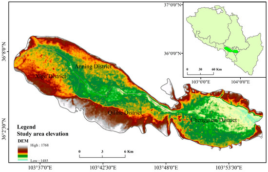 By the end of 2021, Lanzhou City will have five districts and three counties under its jurisdiction, and the city’s resident population is 4,384,300, with an urbanization rate of 83.56%. In this paper, the central urban area where An Ning District, Cheng Guan District, Qilihe District, and Xigu District are located was selected as the study area, as shown in Figure 1.