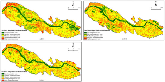 When comparing the urban thermal environment at different times, because of the different imaging times of remote sensing images, the maximum and minimum values of the reflected surface temperature vary greatly, and there are also abnormal temperature values. This is not convenient for direct comparison and analysis, so the images need to be normalized. The mean-standard deviation method [37] was used to classify the surface thermal environment levels in the study area, and the surface thermal environment levels were classified into five categories: low-temperature zone, sub-low-temperature zone, medium-temperature zone, sub-high-temperature zone, and high-temperature zone, as Table 1 shows.