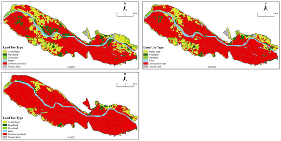 The selected images were imaged during the strongest surface reflectivity of the year, from June to September, including Landsat5_TM images with transit times of 11:18 AM on 13 July 2001 and 11:26 AM on 27 July 2011, and Landsat8_OLI/TIRS images with transit times of 11:37 AM on 4 July, 11:38 AM on 7 August, and 11:38 AM on 8 September 2021, 11:38 AM on 4 July, 11:38 AM on 7 August, and 11:38 AM on 8 September 2021, and Landsat8_OLI/TIRS images. The data were downloaded from the geospatial data cloud (www.gscloud.cn, accessed on 13 October 2022), with strip numbers and row numbers of 131/35 and 130/35, and a spatial resolution of 30 m × 30 m. The remote sensing images of the study area were imaged during the hot summer, with clear weather and less than 5% clouds, and the image quality was good. The images were pre-processed with ENVI 5.3 software for geometric correction, radiometric calibration, atmospheric correction, and study area cropping. Land cover data were obtained from the world’s first 10 m resolution global land cover dataset, FROM-GLC10 [34], developed by Prof. Gong Peng’s team at Tsinghua University, and land cover types were classified as forest, farmland, grassland, water body, and impermeable layer. The building vector data were obtained from Baidu Map, containing information on spatial location, building outlines, and building levels. They were subjected to various forms of data processing such as coordinate projection conversion, height attribute anomaly deletion, and isolated building elements’ removal in non-core areas.