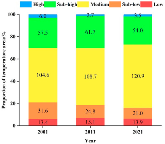 The surface temperature area statistics of different years and levels are shown in Table 3. From Table 3 and Figure 4, the thermal environment of the urban area is shown to be constantly changing from the sub-low-temperature zone and sub-high-temperature zone to the medium-temperature zone, with a phenomenon of gathering in the middle. The area ratio of the low-temperature zone increased from 6.27% in 2001 to 6.50% in 2021. The area ratio of the medium temperature zone increased from 49.09% in 2001 to 56.75% in 2021, which is a significant increase. The proportion of sub-cold-, sub-high-, and high-temperature zones showed a decreasing trend, from 14.82%, 26.99%, and 2.82% in 2001 to 9.85%, 25.34%, and 1.63% in 2021, respectively.