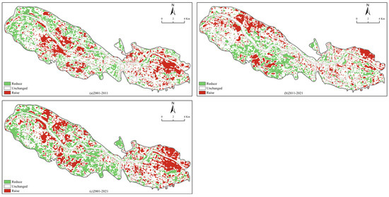 The five classes of LST according to the mean-standard deviation were analyzed in the order of 1~5, from low temperature to high temperature, and if the difference <0, this means the temperature class is decreasing; if the difference >0, this means the temperature class is increasing. The results (Figure 5) show that, from 2001 to 2011, the areas with increasing temperature levels were located in the Yintan, Matan, and Yanbei streets, related to the encroachment of forest land and farmland due to urban construction. In particular, the forested area of Yintan Road, Kongjiaya, and Anningbao Street decreased from 4.31 km2 in 2001 to 0.17 km2 in 2011, and the surface temperature increased by 12.27 °C; the cultivated area of Matan decreased from 2.07 km2 in 2001 to 0.59 km2 in 2011, the forested area decreased from 0.61 km2 to 0.18 km2, and the surface temperature increased by 8.18 °C. The area of forest land in Yanbei Street decreased from 1.37 km2 to 0.1km2, the area of cultivated land decreased from 5.27 km2 to 1.19 km2, and the temperature increased by 11.55 °C. The areas where the temperature level increased from 2011 to 2021 were more scattered than those from 2001 to 2011, mainly in Pengjiaping, Anningbao, and Qingbaishi Street. In 2011, the cultivated area of Pengjiaping was 6.42 km2, and in 2021, this decreased to 1.23 km2, the forested area decreased from 1.45 km2 to 0.73 km2, and the grassland area decreased from 1.18 km2 to 0.44 km2. The surface temperature increased by 7.72 °C, the cultivated area of Anningbao street decreased from 9.29 km2 to 4.35 km2, and the surface temperature increased by 6.62 °C. Arable land in the northwestern part of Xiuchuan Street and the northern part of Chenping Street on both sides of the Yellow River will disappear by 2021; arable land in Qingbaishi Street and the northeastern part of Yanbei Street and the northern part of Donggang Street will decrease from 6.38 km2 in 2011 to 3.13km2 in 2021. The woodland area will decrease from 0.96 km2 to 0.33 km2, the grassland area will decrease from 0.72 km2 to 0.27 km2, and the surface temperature will increase by 9.40 °C. By 2021, the arable land, woodland, and grassland were distributed in the eastern part of Qingbaishi Street, and the arable land and woodland and grassland in Yanbei Street and Donggang Street were replaced by construction land. In general, the distribution characteristics of a temperature increase or decrease from 2001 to 2021 are generally consistent with those from 2011 to 2021.