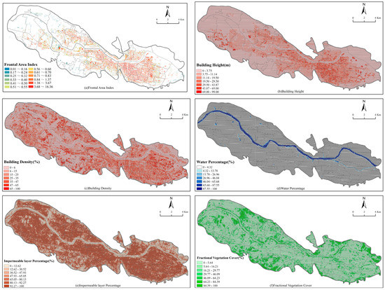 As shown in Figure 6, a 120 m grid was used as the statistical unit to quantify the influencing factors in the central city of Lanzhou using the ArcGIS spatial statistical analysis tool. The spatial distribution of the frontal area index in Figure 6a showed a gradual increase from the eastern part of the An Ning district to the southwestern part of the Chengguan district, with the highest FAI values in commercial and high-rise residential areas generally above 3.68, and the lowest FAI values in industrial parks and low-rise residential areas below 0.56. Figure 6b shows the trend of gradually decreasing building height from the southwest of Chengguan District to the surrounding area, with the building height of most multi-story residential areas below 29.5 m, and the building height of industrial parks and old residential areas generally below 11.14 m. The layout of high-rise building groups is concentrated in Jiuquan Road, Zhangye Road, and Gaolan Road streets in the southwest of Chengguan District. Figure 6c shows the density of buildings near high-rise residential areas, large green areas, and water surfaces to be below 15%; the density of buildings in new multi-story residential areas is 15–65%; the density of buildings in industrial parks, old residential areas, and urban commercial areas is generally above 65%. Figure 6d shows that the spatial distribution of water resources is extremely unbalanced, with the Yellow River running through the city, except for most areas where the percentage of water body area is less than 4.32%. Figure 6e shows the spatial distribution of the percentage of impervious surface area, with 37.33% of the areas having an impervious surface area of more than 90%, reflecting the high level of urbanization in Lanzhou. As can be seen from Figure 6f, the vegetation mainly covers the periphery of the built-up area of the city, with 5.07% of the areas having a coverage above 80% including high vegetation coverage areas such as Lanzhou Botanical Garden, Renshoushan Forest Park, Yintan Wetland Park, Baitashan Park, Tanjianzi Original Wetland Park, and Wuquanshan Park, while the vegetation coverage in built-up areas is generally lower than 16.21%.