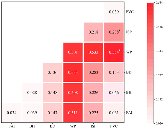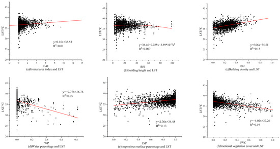 The absolute magnitude of the coefficients represents the degree of influence of the influencing factors on the urban thermal environment. As shown in Table 4, among the above-mentioned factors, building density, the percentage of impervious surface, frontal area index, and building height have positive effects on the surface temperature, and the correlation coefficient values decreased to 0.39, 0.37, 0.13, and 0.02, respectively, representing that building density and the impervious surface in the city are the main factors that lead to the rise in urban thermal environment and heat island effects in the city. The greater the proportion of both in the city, the more heat sources there are in the city, the lower the heat dissipation capacity, and the higher the thermal environment temperature. The factors that have a negative correlation with surface temperature are vegetation cover and water bodies, with correlation coefficients of −0.44 and −0.23, both of which are negative, representing that the above factors can reduce urban surface temperature. The higher the proportion of these in the city, the more significant the cooling and humidifying benefits of vegetation and water bodies, and the more they can alleviate the urban heat island effect.