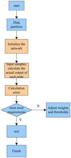 Up to this point, one round of weight change for the three-layer BP network is finished. During the learning period, the BP organization would constantly change based on the actual situation until ideal error accuracy occurs [21,22]. The main reason for the complexity of the BP network is that when adjusting the weight between layers, such as between the middle layer and the middle layer, and between the middle layer and the first layer, the calculation result of the previous step would be used at the current level. Since there are multiple intermediate layers, there are also multiple results, and the computational load is larger and the complexity is higher [23,24]. The flow chart of the BP network algorithm is shown in Figure 4.