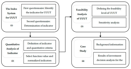 This paper develops an investment decision model based on MIVES, a comprehensive evaluation framework for sustainable development, and incorporates real option theory into the framework to calculate the economic value of UUUT. The flowchart depicted in Figure 1 outlines the four main stages of this paper’s workflow: (1) establishment of the investment decision index system for UUUT; (2) determination of the quantitative criteria for each indicator; (3) calculation of the feasibility of UUUT; and (4) a case study to demonstrate the feasibility of the proposed model.