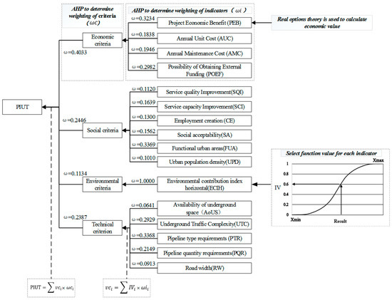 After the screening of indicators and the calculation of weights, we obtain the investment decision model of UUUT based on MIVES and real option theory, as shown in Figure 2.