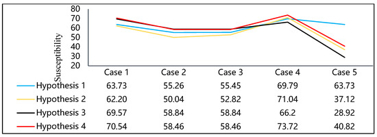 In order to analyze the impact of investor preference and uncertainty risk on the investment decision of the UUUT project, economic, social, environmental, and technical indicators were set as maximum weights respectively. In this case, the economic indicators have been given the maximum weighting, so Hypothesis 1 is the original case. Hypothesis 2, 3 and 4 are three scenarios in which the decision maker focuses on the social, environmental and technical impacts of the project, and the weights for each scenario are shown in Table 12.