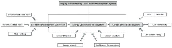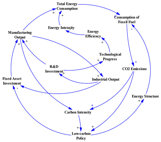 The subsystems do not exist in isolation from each other, they are interconnected and influence each other. In particular, the economic development of Beijing’s manufacturing drives the increase of its energy consumption, then the level of energy consumption directly affects CO2 emissions, which, in turn, affects the level of economic development through low-carbon policies [37]. In this paper, the causal loop diagram, the stock-flow diagram, and specific parameters analysis will be used to reveal the operation mechanism of the system.