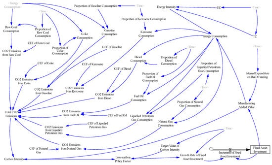 In the manufacturing production process, energy consumption is accompanied by CO2 emissions. Moreover, various types of energy have different carbon emission factors; therefore, the energy consumption structure in the manufacturing industry also affects the amount of CO2 emission. In addition, there is also an interactive relationship between carbon intensity (CO2 emission per 10k CNY of industrial added value in this paper is defined as carbon intensity, and the unit is 10 kt/10k CNY) and low-carbon policies in this subsystem [45,46,47].