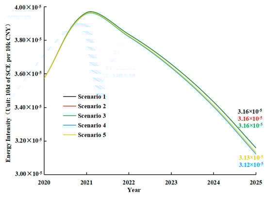 - Scenario 4 (priority model for technological progress in energy conservation and emission reduction): When focusing on technological progress in energy conservation and emission reduction, the energy intensity will be reduced to 3.12 × 10−5 10 kt of SCE per 10k CNY in 2025, which is 12.62% lower than that in 2020; however, this scenario can only satisfy Target 1. Thus, multi-variable regulation for optimization is still required.