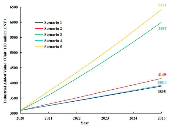 - Scenario 1 (initial model): In the initial scenario, the energy intensity in Beijing’s manufacturing industry will be reduced to 3.16 × 10−5 10 kt of SCE per 10k CNY by 2025, down 11.58% from 2020, and the carbon intensity will drop to 1.01 × 10−5 10 kt per 10k CNY by 2025, which also cannot reach the target value. In addition, due to the low average annual growth rate of R&D investment and fixed asset investment, the proportion of manufacturing added value to GDP in 2025 is 8.45% (The predicted value of GDP in 2025 is calculated on the basis of the Outline for the 14th Five-Year Plan for Beijing’s Economic and Social Development and Long-Range Objectives through the Year 2035), which cannot rise back to the expected level of 13%.