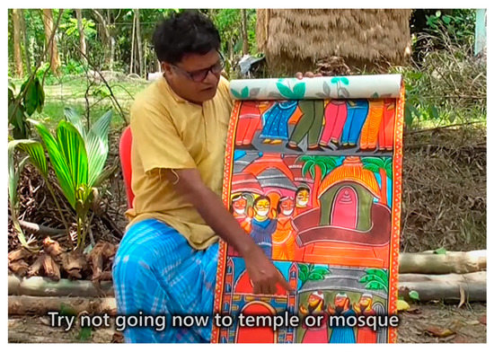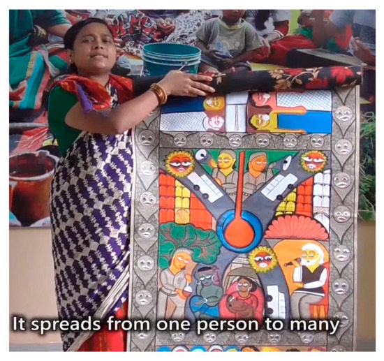 Digital channels gained prominence during the lockdown. However, given the steep digital divide at the rural level of India [91], it was no surprise that the patuas, especially the senior artisans, either lacked access, opportunity, information, or usage of the medium [92]. Nevertheless, given the adoptable and resilient nature of the community, many of them shared their work through WhatsApp, which were uploaded to various social media platforms, such as Instagram and Facebook [92]. Patachitra artists, Swarna Chitrakar (~7 min YouTube clip; see Figure 2), Mamoni Chitrakar (~6 min YouTube clip; see Figure 3), Manu (aka Manoranjan), and Chitrakar (~3 min YouTube clip; see Figure 4), and their associated songs to increase COVID-19 awareness highlighting virus detection procedure, self-hygiene, social distancing, general awareness, community surveillance, and information about government resources for the poor, became an internet sensation.