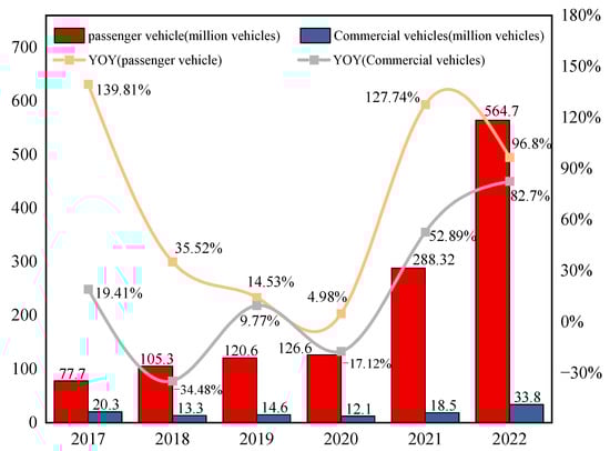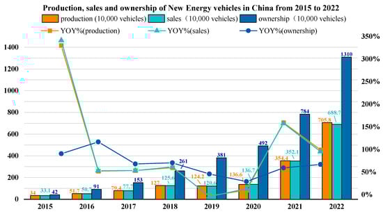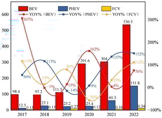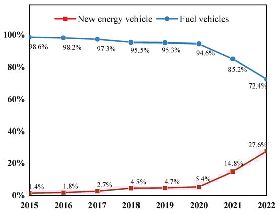 Figure 3. With China’s emphasis on environmental protection and the promotion of the dual-carbon policy, China’s share of NEVs in the overall automobile market has increased year by year, and their types have also diversified, mainly including pure electric vehicles, plug-in hybrid vehicles, and fuel cell electric vehicles [