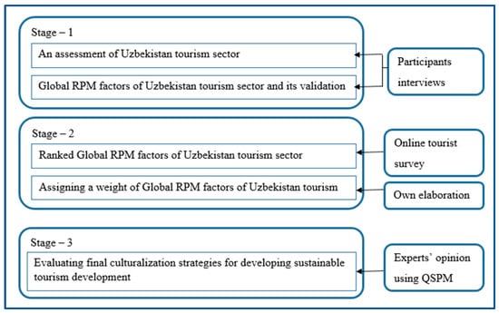 In particular, despite the significance of analyses to explore and evaluate future strategies for tourism sustainability in the previous literature [14,17,19,23,30,31,32], no previous research has been conducted to explore sustainable tourism development in Uzbekistan, and no efforts have been made to identify strategies through Global RPM and QSPM analysis for contribution to tourism sustainability. This represents a significant research gap in the sustainable tourism literature of Uzbekistan. Therefore, our primary objective is to identify the most important issues and barriers to sustainable tourism development in Uzbekistan and propose the most effective strategies to overcome those barriers. The second objective is to develop a methodology that presents a strategic approach to the contribution of tourism sustainability that can be applied to different tourist destinations. In order to accomplish these objectives, the following research questions needed to be answered: