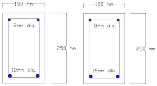 The RC beams were designed to resist a concentrated load located at the mid-span in addition to the beam self-weight. The flexural beams were designed in shear to ensure that the beam will not fail in shear failure mode, using shear stirrups with close spacing to ensure high shear resistance. The procedure for the flexural design using both ρmin and ρmax and the shear design to achieve the highest shear resistance was according to ACI 318 [39] equations. The maximum allowable steel ratio to prevent brittle failure of the concrete, i.e., ρmax, is 0.0136, and the provided maximum steel ratio was 0.0131 by using two 16 mm diameter deformed steel bars as the main flexural reinforcement. The minimum allowable steel ratio to prevent shrinkage cracks, i.e., ρmin, is 0.003. The provided minimum steel ratio was 0.006 using two 12 mm diameter deformed steel bars as the main flexural reinforcement. Two 8 mm diameter round steel bars were used as the compression reinforcement for both design cases. For the shear design, 6 mm diameter bars with a spacing of 50 mm were used along the beam length to achieve the highest shear resistance. Figure 1 shows the cross-section detail for both beams, i.e., ρmin and ρmax.