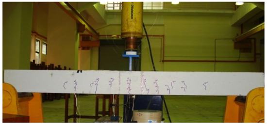 The Classification of the RC beams according to damage levels and design case are shown in Table 1. The properties of the concrete and steel bars for the RC beams are shown in Table 2. The round steel bars of 8 mm and 6 mm diameters were tested, and the samples’ results were in close agreement with a yield stress of 260 MPa and an elasticity module of 185,000 MPa. After the beam is cast, it is left for one year to avoid any effect of the environment or lifetime on the properties of the materials. It is then tested under point load located at mid-span, where the load is applied gradually at a loading rate of 4 kN/min, i.e., loading and unloading. Figure 2 shows the RC beam under flexural loading conditions.