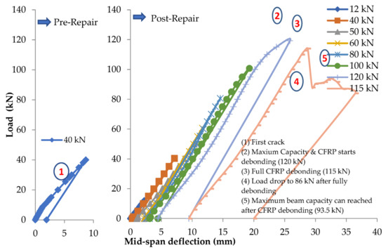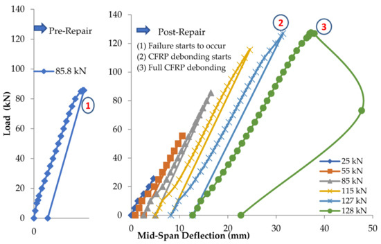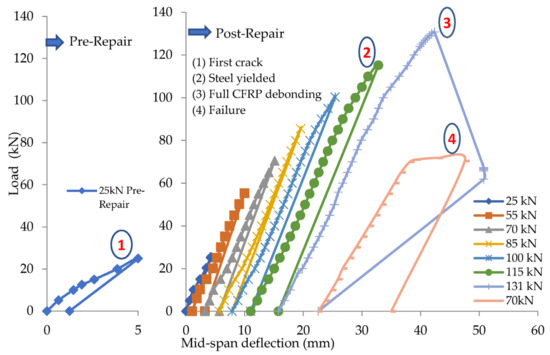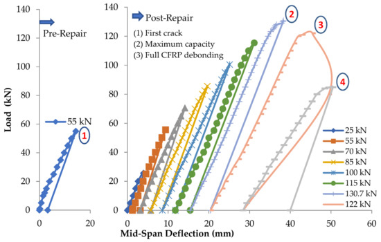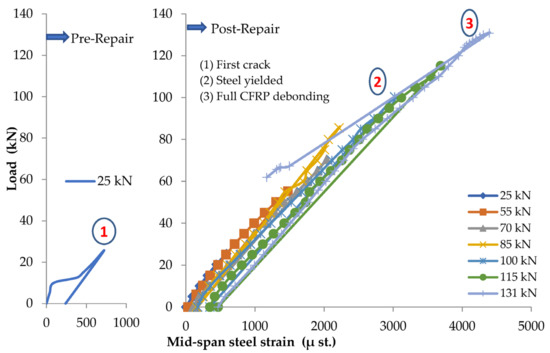 The reinforced beam B123m is damaged under 55 kN concentrated loading at mid-span, which is considered close to the yield limit of the steel reinforcement. After inducing damage, the beam is repaired, and the load is applied in cycles, where the load cycles and the corresponding number of cracks are shown in Table 5. The load against deflection curves at pre- and post-repair stages are shown in Figure 7. The load against steel strain curves at pre- and post-repair stages are shown in Figure 8. For the post-repair stage, the load vs. CFRP strain curves is shown in Figure 9.