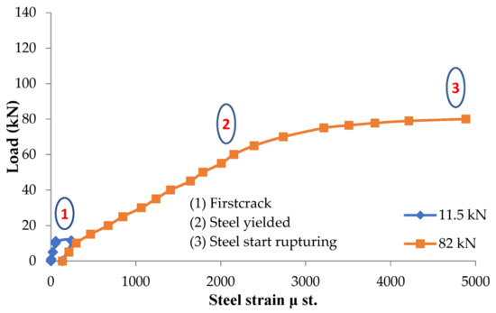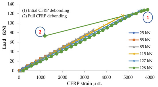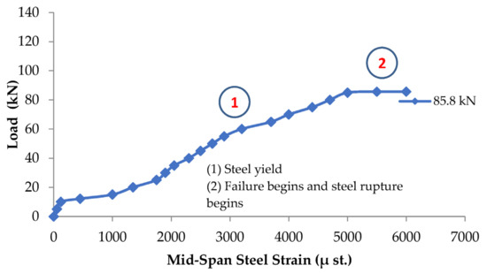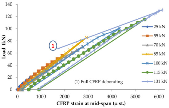 Figure 4, Figure 5 and Figure 6 show that the repaired beam reaches a load capacity of 131 kN, and the corresponding CFRP debonding strain reaches 6150 μst. Beyond the CFRP debonding point, steel strain shows a rapid decrease corresponding to the rapid decrease in applied load and the rapid increase in deflection as shown in Figure 5. Figure 5 also shows that steel yielded at a load of 115 kN with strain of about 3100 μst. The beam records a steel strain of 4300 μst, less than the rupture strain of steel beyond 6000 μst. This indicates that the steel did not rupture and was the reason behind the ability of the beam to withstand a load of up to 71 kN after the CFRP debonding. This is considered the capacity of the unrepaired section, wherein the CFRP sheets take up most of the tension stresses at the stage before the CFRP debonding. After CFRP debonds, the failure mode is a flexural failure, meaning that the concrete did not fail and the un-ruptured steel takes up all the stresses. The capacity increase due to adding the CFRP sheet is evaluated based on the repaired capacity (131 kN) divided by the unrepaired capacity (71 kN), which gives an increase of 84.5%.