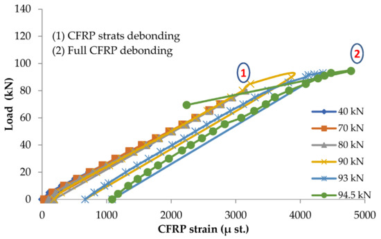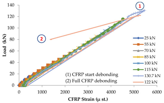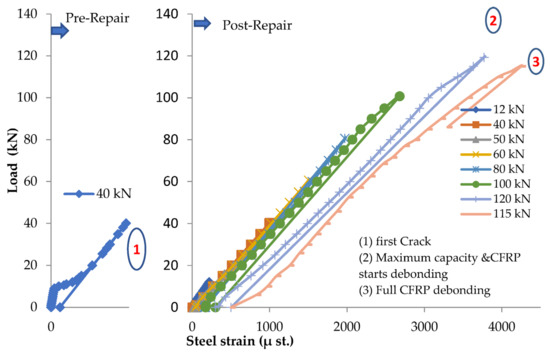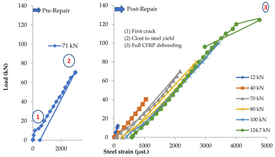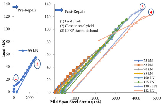The reinforced beam B124m is damaged under failure load, which reaches 85.8 kN. The applied load is stopped when the failure is initiated, indicating that the load against the deflection curve becomes horizontal. After the induced damage, the beam is repaired, and the load is applied in cycles. The load cycles and the corresponding number of cracks are shown in Table 6. The load against deflection curves for load cycles at pre and post-repair stages are shown in Figure 10. The load against steel strain curves at the pre-repair stage are shown in Figure 11. No data for the steel strain at the post-repair stage is recorded since the strain gauges were broken when the failure occurred at the pre-repair stage. For post-repair stages, the load against CFRP strain is shown in Figure 12.