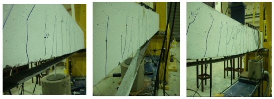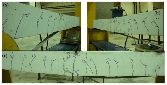 The failure mode is an intermediate-induced crack debonding. The flexural cracks at the mid-span extend to the adhesive interface between the CFRP sheets and the concrete surface, thus inducing intermediate cracks that cause the full CFRP debonding at higher loading. Figure 24 shows the actual cracks in the beam, where intermediate-induced cracks appear in the adhesive layer, and full CFRP debonding occurs. The failure of the CFRP-repaired flexural beams designed with ρmax is governed by the intermediate crack debonding, which is in good agreement with the findings of Büyüköztürk and Hearing [42], and different from the failure observed by Benjeddou et al. [28] which was peeling of CFRP sheets at the ends.