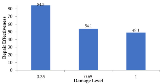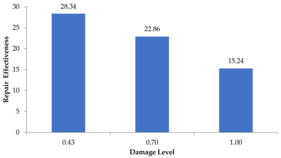 The effectiveness of the CFRP repair system for different pre-repair damage levels and flexural beams designed according to ρmax are presented here. The stiffness recovery based on the static data is calculated based on the ratio of the increased capacity of the repaired sections to the ultimate capacity of the unrepaired sections. Figure 25 shows the repair effectiveness based on the static data and corresponding to the damage levels of beams B112m, B113m, and B114m. The results show that fixing the CFRP sheets as a flexural repair system for flexural beams with ρmax is effective regardless of the pre-repair damage level. The increase in the load capacity depends on the pre-repair damage level. For a damage level of 43%, close to the design load limit, the repair with CFRP sheets increases the ultimate capacity by 29%. For a pre-repair damage level of 100%, the increase in the load capacity is limited to 15.3%.