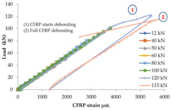 Beam B112m is subjected to a damaged load of 40 kN, close to the design load, at the pre-repair stage. After repair, the beam is subjected to load cycles up to failure, as shown in Table 7 presents the load cycles and the corresponding number of cracks. The load against CFRP strain at post-repair stages are shown in Figure 15. The load against deflection curves at pre- and post-repair stages are shown in Figure 16. The load against steel strain curves at pre and post-repair stages are shown in Figure 17.