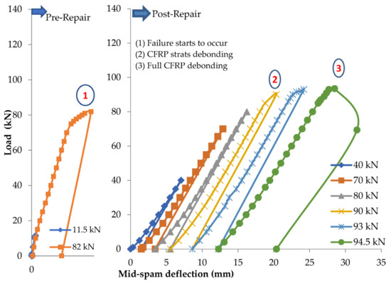 - Existing pre-repair flexural fractures at the mid-span extend to the adhesive interface between the CFRP sheets and the concrete surface. As a result, intermediate cracks are induced, which lead to the complete debonding of the CFRP when the loading is increased.