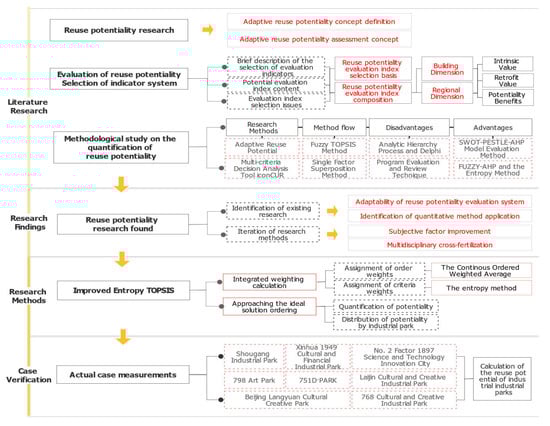 In recent years, it has become critical to promote urban redevelopment and maximize the potentiality of industrial heritage through adaptive reuse. Research on the assessment of adaptive reuse potentiality helps to make scientific decisions in sustainable development and the strategy for utilizing industrial heritage. The purpose of this paper is to provide a comprehensive overview of the research on the potentiality of buildings or sites. It also constructs a system for the assessment of adaptive reuse potentiality in industrial heritage and describes the characteristics of different dimensions in the indicators of potentiality evaluation. Utilizing the Improved Entropy Technique for Ordering Preferences by Similarity to the Ideal Solution (Improved Entropy TOPSIS), the relative values of the reuse potentiality of each hierarchical evaluation index are calculated, and an adaptive reuse potentiality ranking of various industrial parks is determined. Through the calculation and analysis, it is demonstrated that the application of this quantitative method to the industrial heritage potentiality evaluation system is highly applicable. This paper’s research framework for adaptive reuse potentiality and empirical findings provides targeted recommendations for determining the reuse potentiality and potential hierarchy of industrial heritage, identifying buildings with a high potential for reuse, and developing adaptive reuse strategies to better direct industrial heritage in urban regeneration.