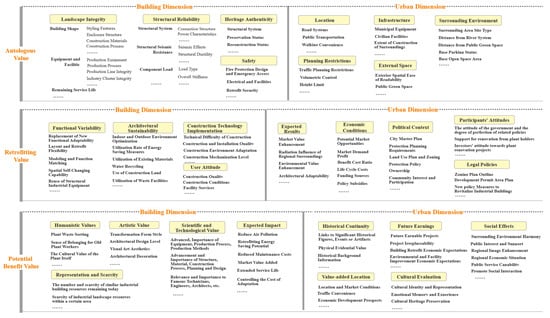 The former scholars defined architecture reuse potentiality as a capacity that needs to be stimulated externally and provides practical benefits [15], a capacity that contains the possibility of reuse hidden in itself and any intervention capacity to adapt to new conditions [16], which represents the potentiality for future transformation and the sustainability of the project after renovation. This paper defines the adaptive reuse potentiality of industrial heritage as the ability of the heritage to contribute to its own and to the city’s sustainable development by providing practical benefits to subsequent development. This potentiality can be reflected in three dimensions: autologous value, retrofitting value, and potential benefit value. The first represents the potentiality for the industrial heritage to be reused, the second represents the potential ability for efficient use after reuse, and the third represents the potential ability for retrofitting to bring actual benefits to the region or city.