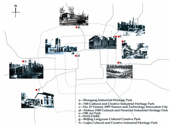 In China, the city of Beijing was early in carrying out practices of industrial heritage conservation and reuse, and it has taken the lead in conducting a census and academic research on industrial heritage. From the announcement of 30 existing industrial heritage sites in Beijing by the Architectural Society of China’s Academic Committee on Industrial Architectural Heritage in 2010 to the first batch of China’s Industrial Heritage Protection List in 2019, 9 industrial heritage sites in Beijing were selected [25]. The preservation and reuse of Beijing’s industrial heritage are becoming more important. Beijing’s existing urban industrial heritage can be divided into nine national, six municipal, and several general industrial heritage sites, totaling 2500 hectares and generally possessing multiple groups of architectural monuments.