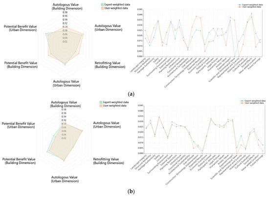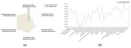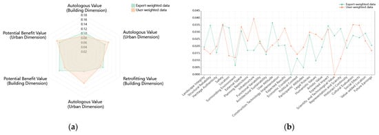 Comparison of potential evaluation distribution in 798 Art Park. (a) Distribution of reuse potential of primary indicators; (b) distribution of reuse potential for secondary indicators.
