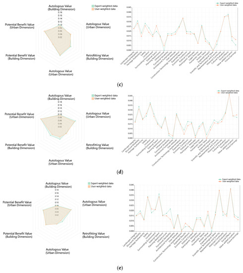 Figure 7 depicts the potential measurement results for 751D-PARK. The user evaluation has a higher value than the actual measurement potential among the autologous and retrofitting values of the urban dimension, indicating that its renovation has a larger impact on the urban area than the actual predicted potential size. The potential benefits of the urban dimension and the building itself stand out more.