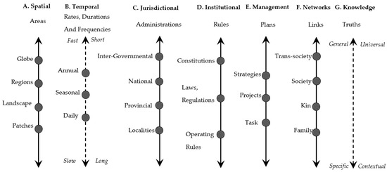 Schematic illustrations of different scales and levels that are critical in understanding and responding to human–environment interactions [14,15].