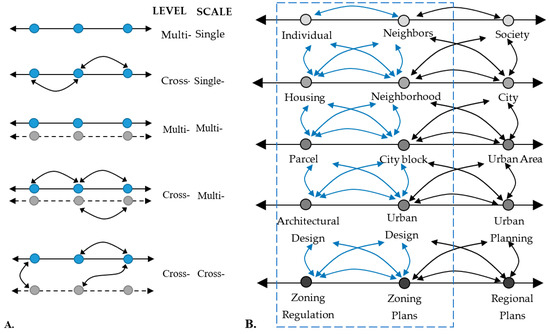 (A) Schematic illustrations of cross-level, cross-scale, multilevel, and multiscale interactions [14]. (B) Schematic illustrations of different scales and levels in residential areas or built environments (cross-level cross-scale). (B) is by first author—unpublished doctoral dissertation).