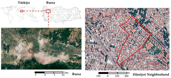 The Hürriyet Neighborhood located in Bursa was selected for the field study. Bursa is the fourth largest city in Türkiye in terms of population. Along with its history and geographical potential, it is a developing city with job creation due to industrialization, and its population is increasing rapidly with the (internal–external) immigrants it has received. The Hürriyet Neighborhood is one of the neighborhoods in Bursa where Turkish immigrants from the Balkans settled in the 1950s and where new immigrants have arrived over time through kinship and neighborhood ties. The neighborhood is characterized by low-rise buildings, and housing supply is met on a parcel-by-parcel basis [37]. It can be said that it has preserved its general physical and socio-cultural character until now. Therefore, Hürriyet Neighborhood was found suitable for the research due to its local users and neighborhood characteristics.